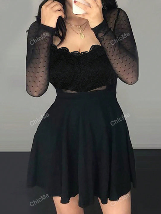 Black Lace And Mesh Splice Sheer Party Dress With Long Sleeves