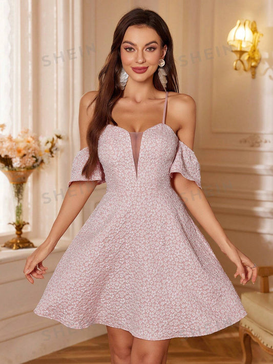 Belle Women's Elegant Jacquard Mesh Splice Open Shoulder Sleeve Summer Evening Party Dress