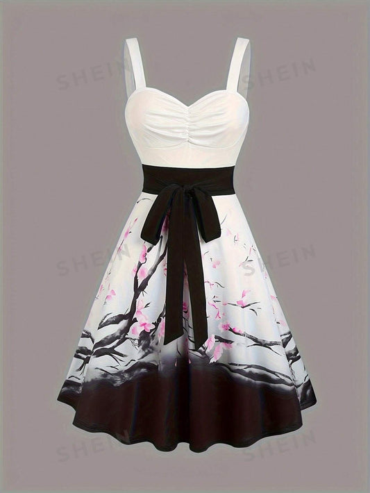 MOD Women's Elegant Floral Printed Color Block Spaghetti Strap Dress, Summer