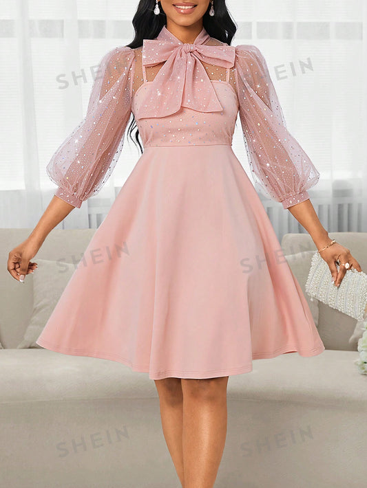 Lady Four Season Women's Fashionable Urban Lightweight Party Dress Christmas Dress Homecoming Dress Short Fall Wedding Guest Dress Fall Women Dresses With Bowknot Collar, Mesh Body, Puff Lantern Sleeve And Flare Hem In Pink