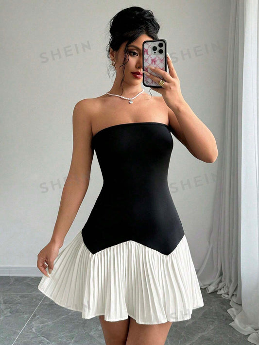 Elenzya Elegant Women's Contrast Color Black & White Pleated Summer Tube Top Sleeveless Dress