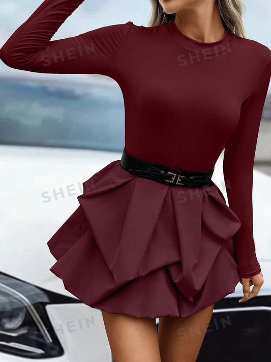 Privé Women's Plain Round Neck Long Sleeve Ruched Hem Dress, Spring & Summer