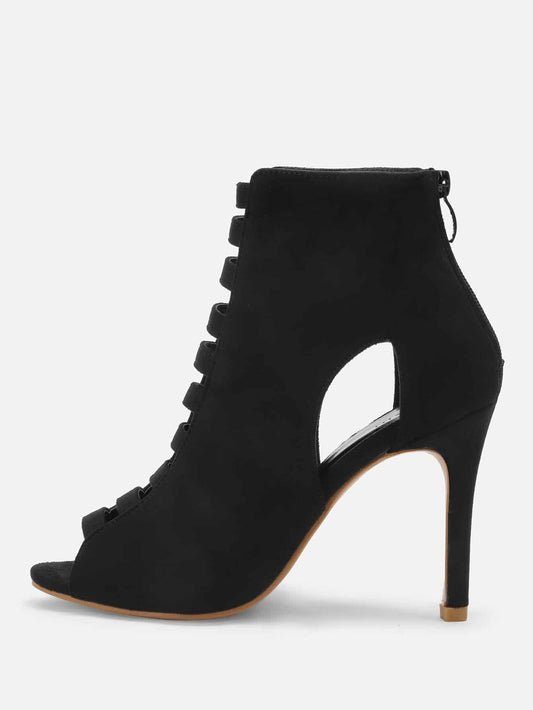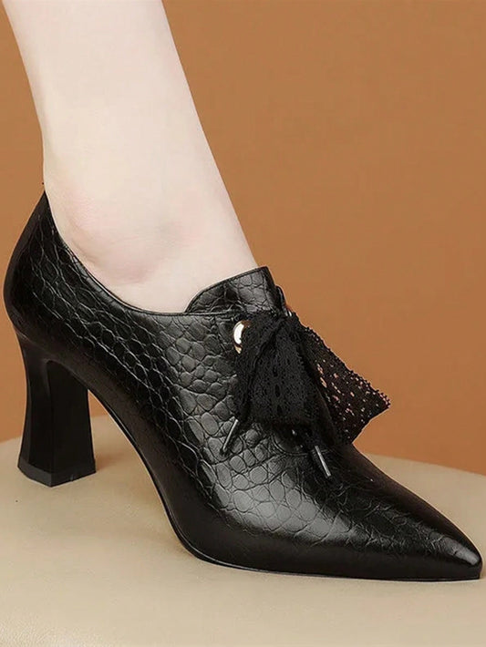 Women's Fashion High Heel Side Zipper Single Shoes, Pointed Toe, Black Lace-up Embellished Deep Mouth, Spring & Autumn High-top Ladies' Fashion Shoes