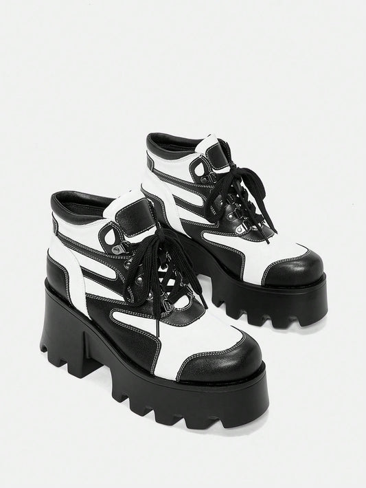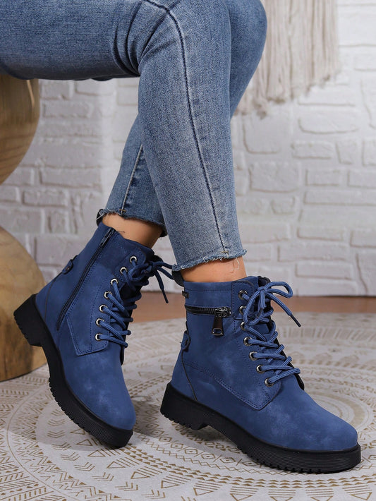 Women Minimalist Lace Up Side Zip Chunky Heeled Combat Boots