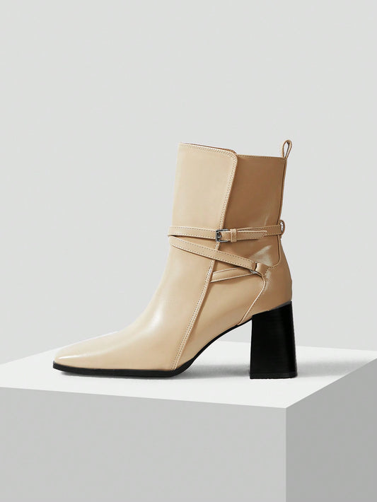 MOTF PREMIUM SQUARE TOE BUCKLE DECOR ANKLE BOOTS