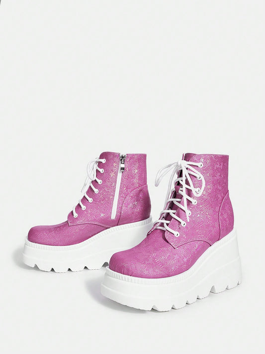 Pink Lace-up Wedge Heel Round Toe Ankle Boots For Women
