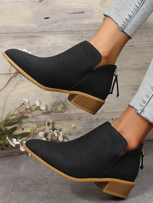 EMERY ROSE Elegant Black Booties For Women, Zipper Back Point Toe Chunky Heeled Boots