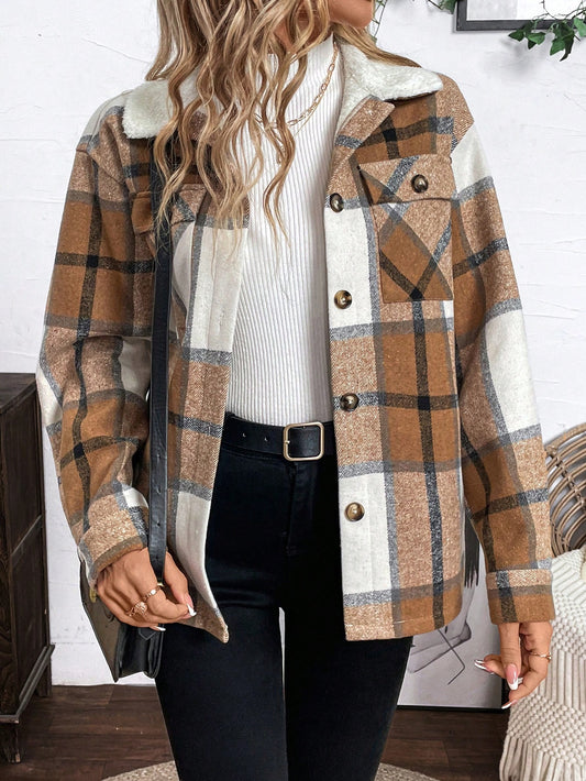 LUNE Plush-Lined Warm Khaki-Brown Plaid Shirt-Style Jacket For Women, Autumn Winter