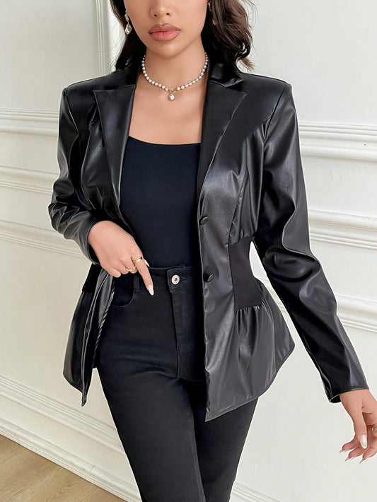 Modely Women's Solid Color Lapel Neck Long Sleeve PU Leather Cinched Waist Regular Jacket, Autumn