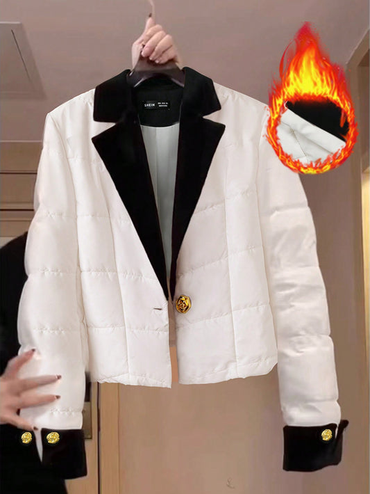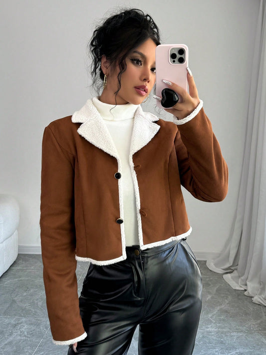 Relaxiva 1pc Women's Autumn/Winter Fashion Contrast Color Collar Fleece Cropped Jacket