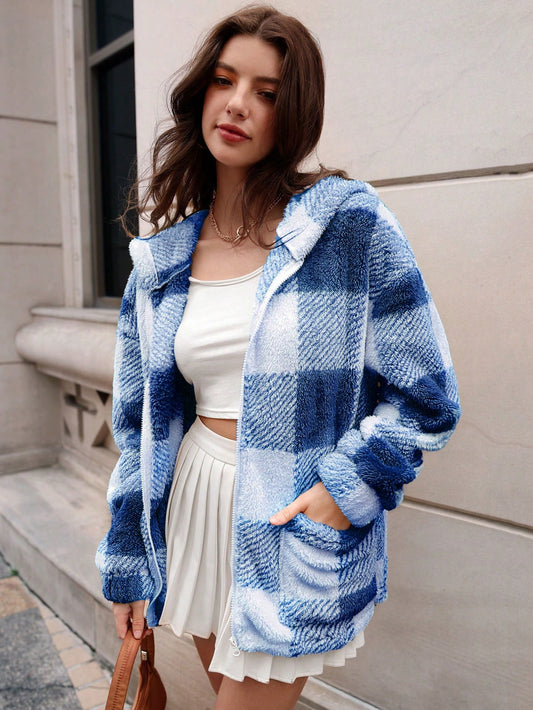 EZwear Color Block Plaid Fleece Lined Hooded Jacket For Autumn & Winter, Casual