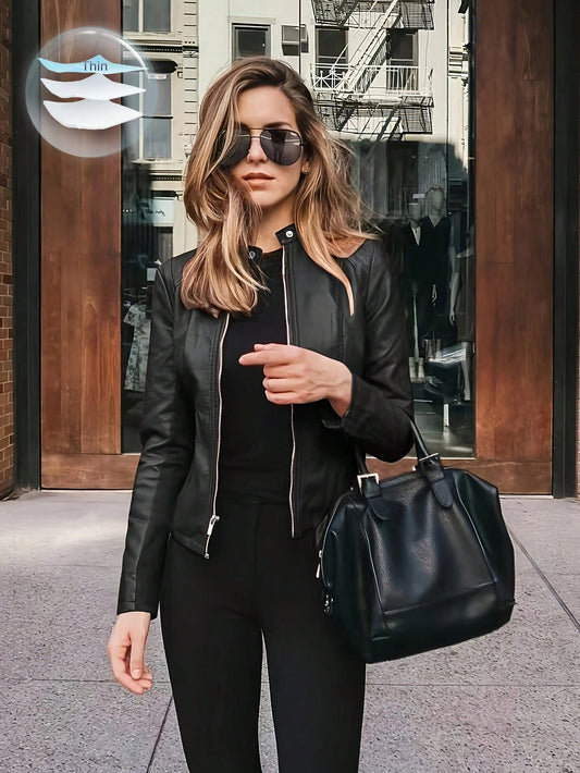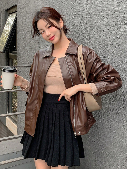 DAZY Women Casual Solid Color PU Loose Regular Jacket, Autumn