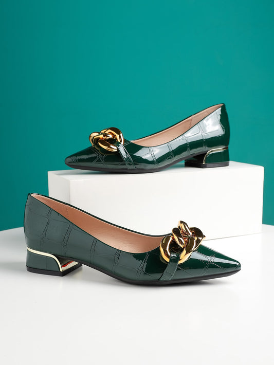 Women's Green Fashionable Flats With Chain Decoration, Crocodile Pattern Texture And Embossed Link Design
