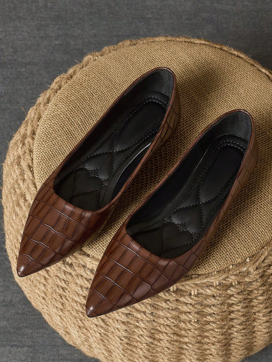 Litchi Embossed Point Toe Ballet Flats, Black Elegant Solid Color Women's Flat Shoes