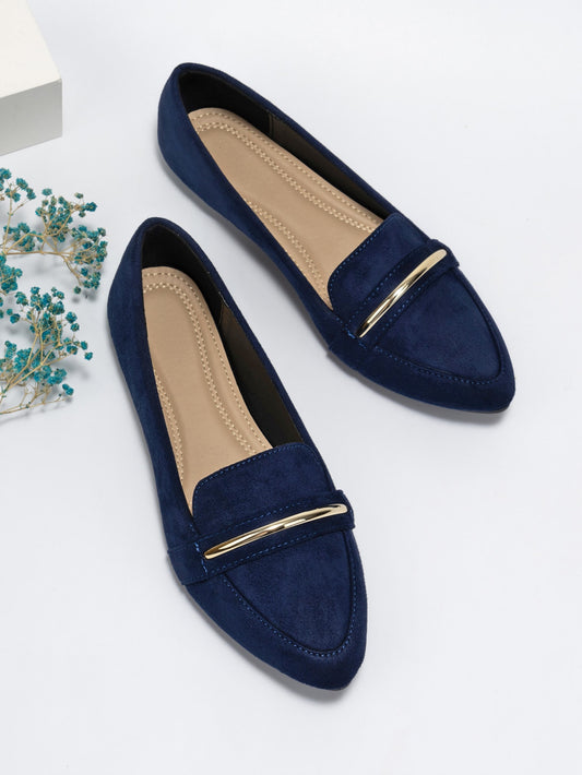 Metallic Decor Suedette Loafers, Blue Elegant Solid Color Loafers Made Of Pure Metal