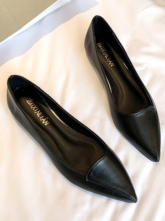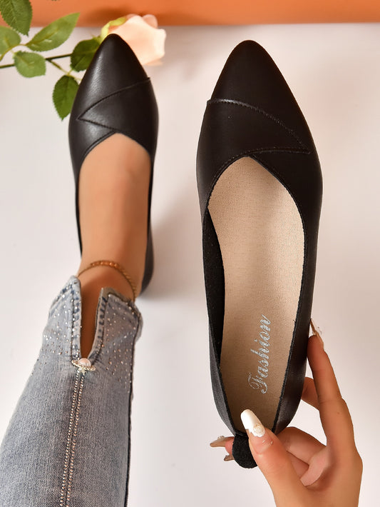 Women's Comfortable Breathable Solid Color Pointed Toe Low-cut Slip-on Flat Shoes, Suitable For Moms For Outdoor Activities, Shopping, Indoor Home, Autumn, Black, Pu Leather And Soft Bottom