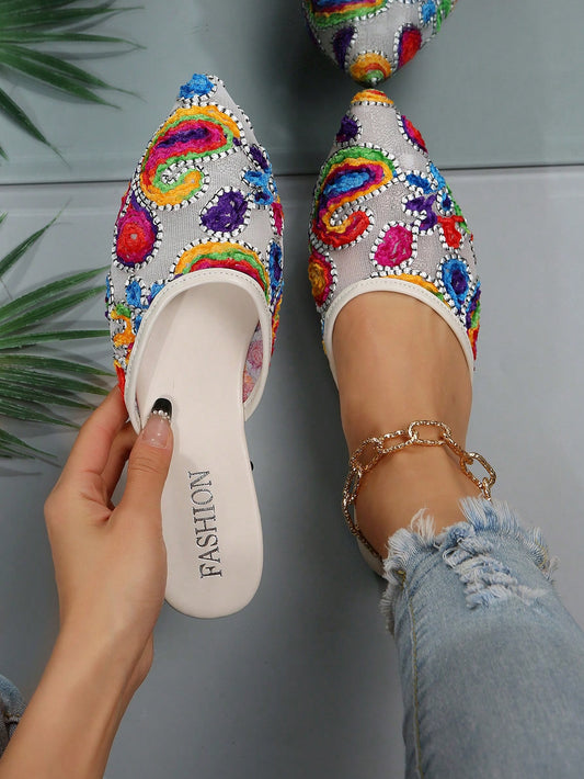 Fashion Flats For Women, Colorblock Embroidery Detail Point Toe Flat Mules