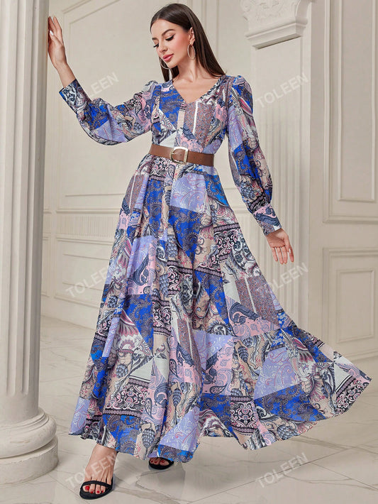 Patchwork Print Lantern Sleeve Dress Without Belt