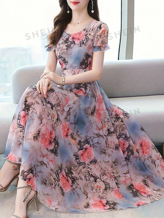 Clasi Women's Round Neck Long Sleeve All-Over Floral Print Elegant Dress (Random Floral Patterns)