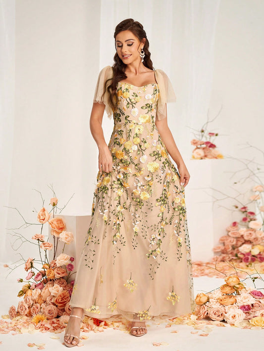 Belle Elegant Romantic Shiny Colorful Embroidered Lace A-Line Flowy Party Maxi Dress For Formal Events
