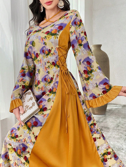 Women's Solid & Floral Print Patchwork Long Sleeve Arabian Dress