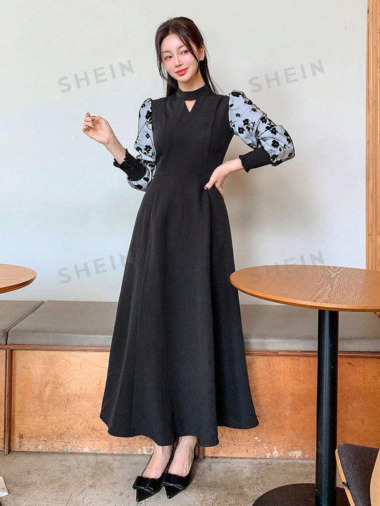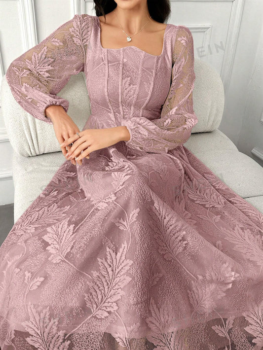 Modely Women's Elegant Floral Mesh Lantern Sleeve Dress