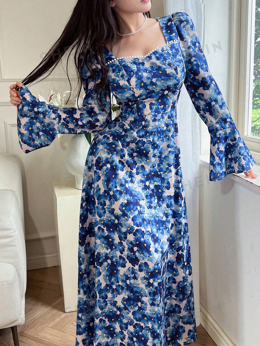 Mulvari Women's Floral Print Sweetheart Neck Bell Sleeve Elegant Dress