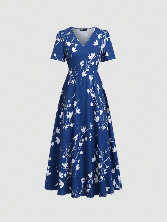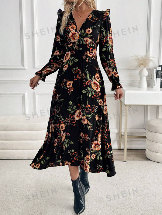 Clasi Ladies Floral Print V-Neck Long Sleeve Dress, Suitable For Autumn/Winter Parties