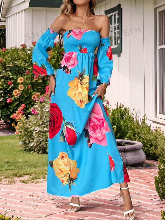Women's Floral Print Vacation Dress With Off Shoulder Design, Loose Fit And Straight Cut