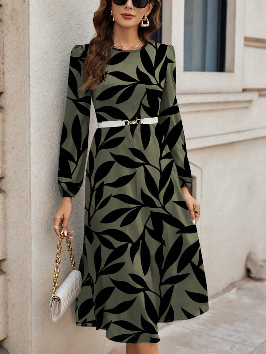 Clasi Green Base Silhouette Print Long Sleeve Dress, Suitable For Autumn/Winter