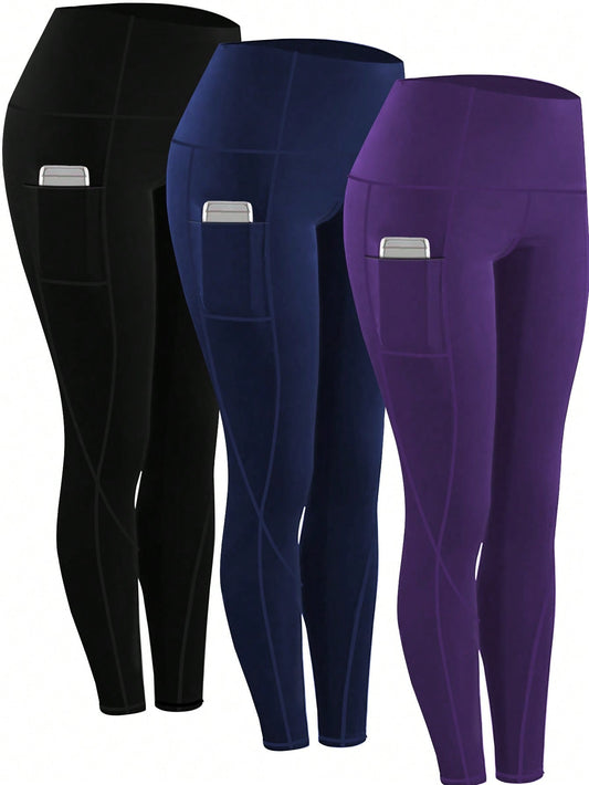 3pcs Women's High-Waisted Tight Yoga Pants Set With Pockets, Compression Leggings For Sports, Fitness, Running