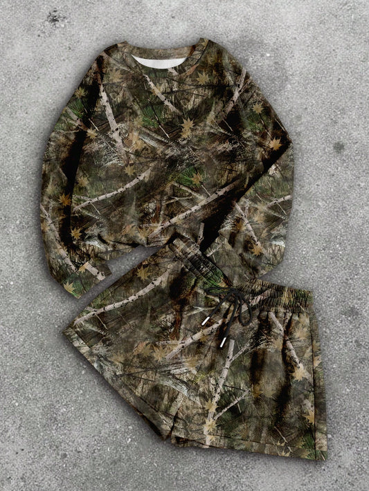 INAWLY Women Casual Trendy Camouflage Tree Branch & Leaf Letter Print Round Neck Sweatshirt And Drawstring Shorts Set