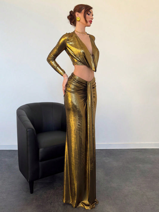 Aloruh 2pcs Set: Elegant Vintage-Look Coated Fabric Ruched Collar Long Sleeve Top And Low Waist Pleated Skirt Suit