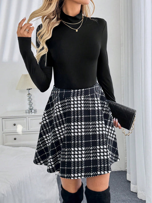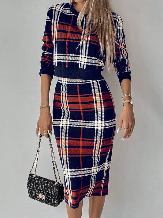 Clasi 2pcs Women Plaid Round Neck Long Sleeve Top And A-Line Skirt Set