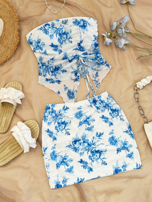 WYWH Women Blue Floral Print Drawstring Bandeau Top And Ruched Skirt 2 Piece Set For Beach Resort