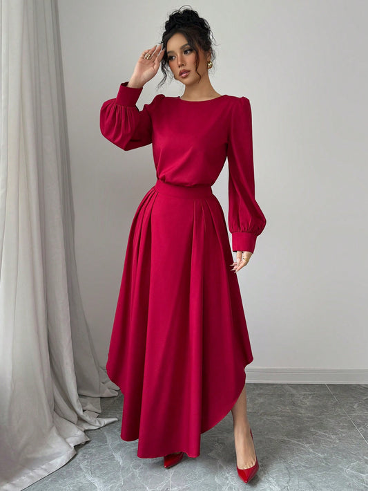 Elenzga 2pcs Women Set: Round Neck Long Sleeve Top And High Waist Asymmetrical Hem Skirt