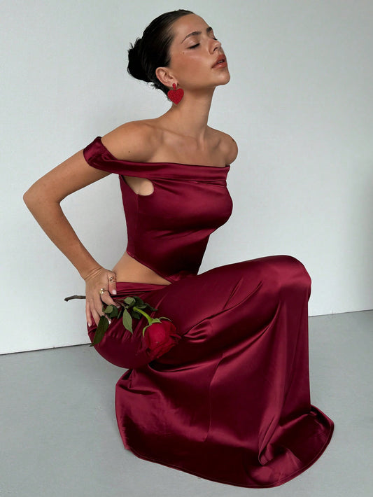 Aloruh 2pcs Women's Valentine's Day Elegant Sexy New Years Holiday Party Dress Set: Asymmetric Open Shoulder Tight Bustier Top With Pointed Hemline And Burgundy High-Waist Pleated Mermaid Skirt, Suitable For Spring, Summer, Autumn, Winter