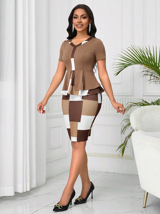 Lyxana 2pcs/Set Plaid Patchwork Ruffle Hem Casual Top And Skirt Set