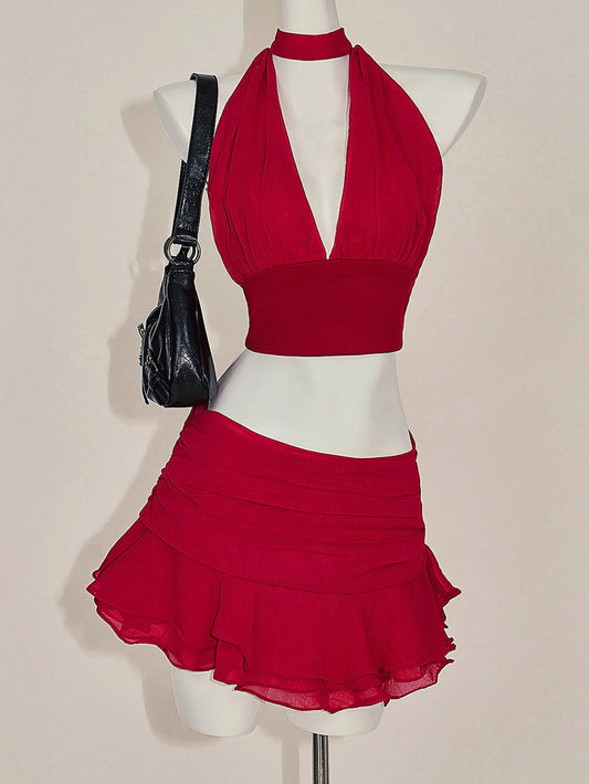 ICON Y2k Hot Red Valentine's Day 2-Piece Set: Fitted Ruched V-Neck Camisole With Ruffle Hem & Wide Waistband Skirt