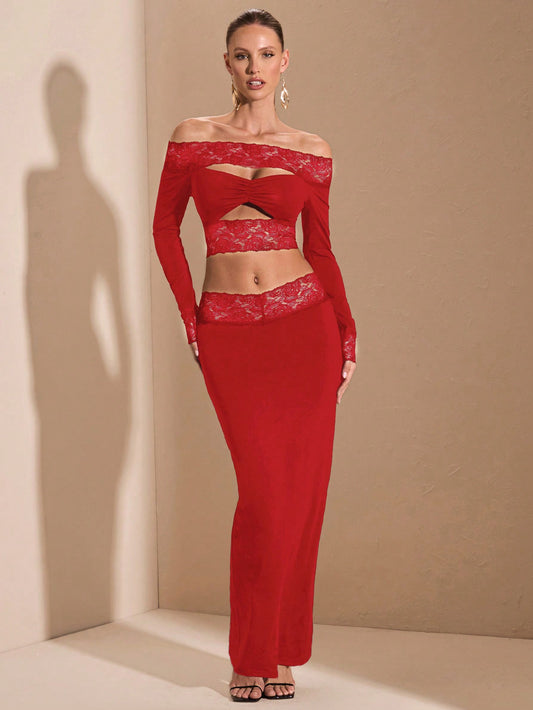 BAE Elegant Lace Trim Off Shoulder Hollow Out Crop Top And Skirt Set