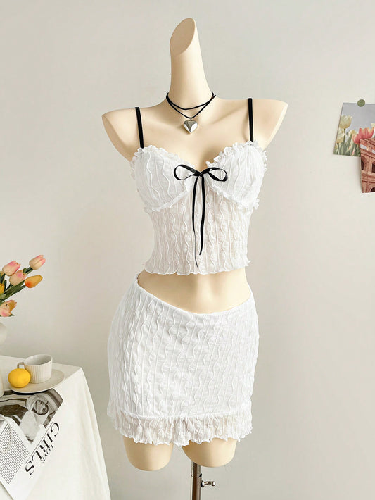 WYWH Vacation White Knitted Textured Chest With Ruffle Design, Black Ribbon Front, Black Shoulder Strap, Fitted Tank Top And Fitted Mini Ruffle Hem Skirt 2 Piece Beach Clothes Outfit Set, For Party/Summer