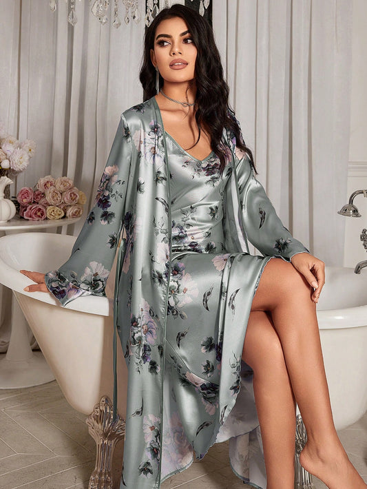 Floral Printed Satin Cami Slip Dress And Robe Pajama Set