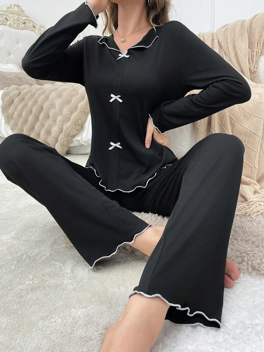 Autumn/Winter Lightweight Faux Cardigan & Bow Accent Comfortable Pajama Set