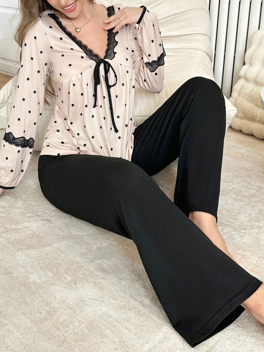 Romantic Polka Dot Print Contrast Color Lace Bow V-Neck Long Sleeve & Pants Ladies Pajama Set