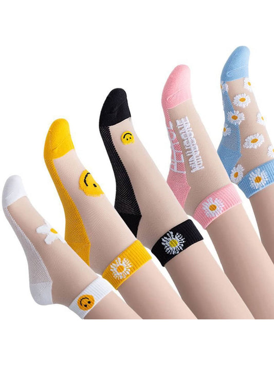 【5pairs/pack】women's Thin Ins Style Small Chrysanthemum Embroidery Sheer Socks
