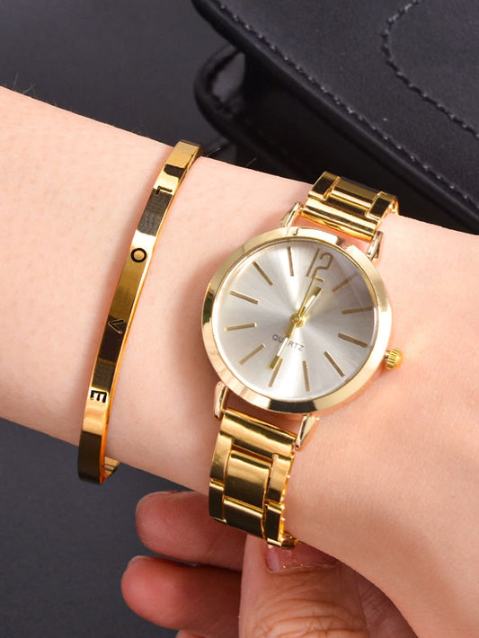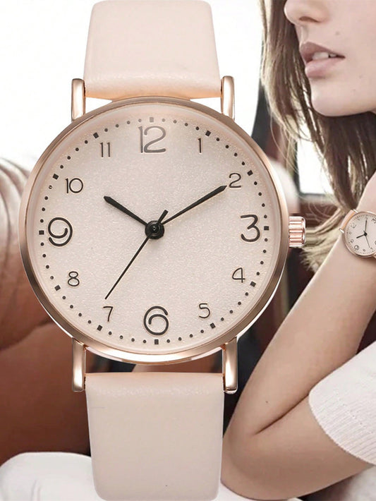 1pc Simple Round Pointer Quartz Watch With 1pc Bracelet