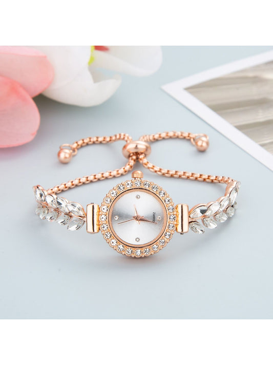 New Fashionable Women's Watch & Bracelet Set, With Lovely Round Dial Decorated With Rhinestones Plus Crystal/Leaf/Feather Shaped Strap, Made Of Alloy And Quartz, Great Gift Option Holiday As A Gift For Students Returning To School