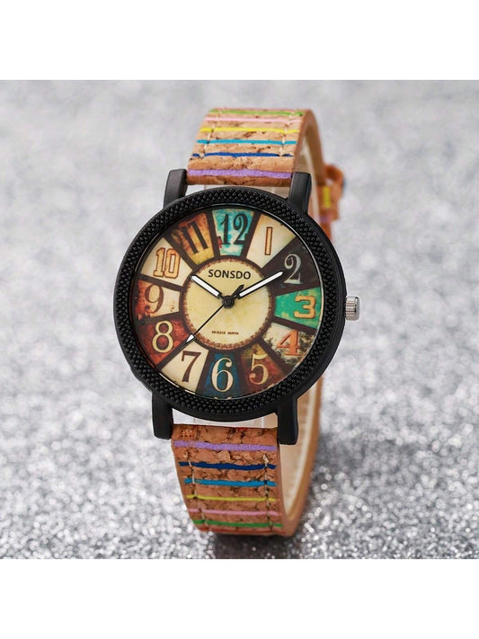 Fashionable Wood Design Ladies Watch With Rotating Dial, Vintage Striped Pattern Leather Watchstrap, Great Gift For Students