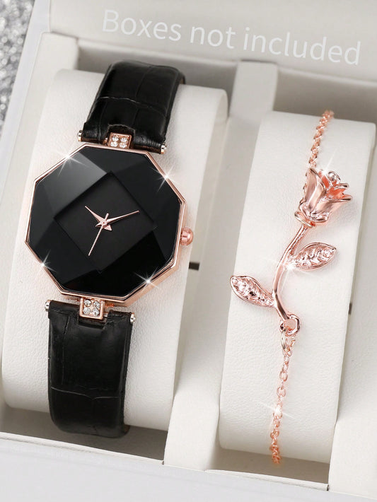 1pc Black Crocodile Embossed Rhinestone Decor PU Polyurethane Strap Fashion Geometric Dial Quartz Watch & 1pc Bracelet, For Daily Life