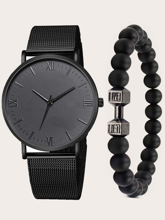 1pc Men Mesh Strap Round Pointer Quartz Watch & 1pc Bracelet